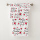 Linda Bath Towel Set apresentando um padrão bonito com pequenas flores e corações vermelhas e saudações de Dia de as mães Feliz sobre fundo branco.