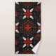 Intricate black background with a symmetrical floral pattern in red, white, and gold. Curved lines and dots add detail, creating an elegant, festive feel.