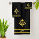 Golden fleur de Lis, monogram and stripes on black. Elegant modern towel set. Image only on one side.