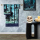Este assombroso, exibições gráficas, um alto, antigo, ferro em formas brutas, entrada do portão. No pátio, na base do pínus, pé, uma figura fantasmagórica, pregada em um pano preto fluente no topo dos degraus, em uma colina, é uma mansão enorme, gótica, envolta em neblina espessa, destacada por esta frase assustadora, "Aproveite um Belo Feriado", em exaustão, gotejante, fonte preta!