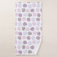 Este conjunto de toalhas tem um pano de lavagem azul claro, uma toalha de mão roxa, e uma toalha de banho com um design de espirais de deco artístico em tons de roxo, azul claro e marrom, num campo de branco. Se você quiser o mesmo design com cores diferentes, me mande uma mensagem.