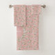 Este adorável conjunto de toalhas de banho apresenta um lindo padrão francês de margaridas brancas, folhas verdes e vinhas em um fundo rosa do milênio. A design é baseada em flores pintadas à mão. Vai lembrá-lo de um jardim rural! A toalha de banho pode ser personalizada com seu nome e inicial. Você também pode mudar a cor de fundo para qualquer cor que desejar.