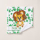 Este leão giro está sentado esperando para brincar. Atrás dele está um fundo branco com um padrão de folhas da selva. Debaixo dele está o nome do seu filho, que está brincando na floresta tropical com ele. Adicione um amigo bonitinho à hora do banho do seu filho!