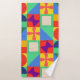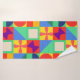 Este conjunto de toalhas tem um pano de lavagem de ouro, uma toalha de mão laranja, e uma toalha de banho com um design de quadrados Bauhaus de formas ímpares, repetida através do design.