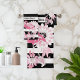 O design apresenta um flamingo com padrões paisley caleidoscópicos em tons de rosa sobre fundo de listras brancas e pretas. Este design de pássaros tropicais com texto personalizado faz toalhas de banho modernas e únicas.