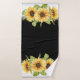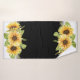 Estas toalhas de girassol são lindas e dramáticas. A toalha de banho é preta, transformando-se em branco, com grandes e elegantes girassóis em cada extremidade. O pano de lavagem é branco com uma borda preta e amarela e um buquê de girassóis amarelos. A toalha da mão é preta a esbranquiçada e personalizada com uma inicial de monograma.
