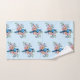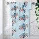 Um pássaro azul rodeado por flores de primavera cor rosa, púrpura e pêssego colorido colorido contra um pano de fundo azul claro.