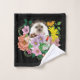 Um ouriço bonito sentado entre flores coloridas de verão num pano de fundo preto