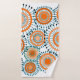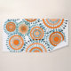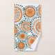 Este conjunto de toalhas tem um design de anéis e círculos em tons de laranja com linhas de lacre atrás deles formando flores em um campo de branco.