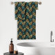 Este conjunto de toalhas do banheiro apresenta um padrão de frondes de folhas tropicais de palma azul e douradas em um fundo preto.