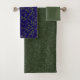 Este conjunto de toalhas de banho apresenta um sofisticado padrão verde e azul escuro. O design exibe uma apresentação vibrante e esteticamente agradável com sua bela folhagem.