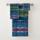 Conjunto de Toalhas de Banho de 3 amenidades decorativas de banheiro e acessórios de decoração para casas impressos com quatro partes Harmony Translucent Alternating Shapes ovais, voltas e curvas abstrato de arte geométrica design de de ilustração de arte original padronizada por TheFabricSeal impressão a pedido compro Zazzle.com #ZazzleMade https://www.zazzle.com/store/thefabricseal TheFabricSeal ©️ Original. Transforme seu banheiro em seu próprio oásis pessoal com uma toalha personalizada perfeita para te secar no estilo. O conjunto de toalhas é um presente excelente para muitas ocasiões. Desenho moderno, moderno e moderno, de arte digital translúcida e transparente e ondulada, desenhada artisticamente e impressa para seus acessórios residenciais e vivos, decoração domiciliar, declaração de moda, acessórios eletrônicos modernos e tons de presentes. Esquema de cores belamente equilibrado, complementar e harmonioso com azul de girassol, Yinmin Oregon Mas azul, verde azul Picton, branco cremoso, cor vermelha de Alizarin, verde de maçã verde-mirante de vovó e paleta verde-coloração de iguana num fundo preto a jato ebony embaixo.
