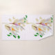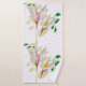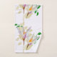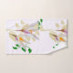 Este trabalho de arte de toalha de banho apresenta delicados elementos florais semelhantes a croco, emoldurados por veias beges e vinhas verdes, com folhas brancas translúcidas, acrescentando profundidade e textura sobre um fundo de linhas concêntricas, em forma quadrada, criando um contraste elegante.
