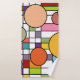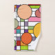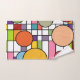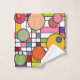 Este conjunto de toalhas tem um design moderno do século médio de uma grade com alguns retângulos coloridos e círculos no topo em cores retrorreflectoras.