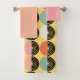 Este conjunto de toalhas tem um pano de lavagem rosa, uma toalha de mão de pêssego, e uma toalha de banho com um design moderno do século médio de semicírculos sólidos combinados com semicírculos concêntricos preto e branco, tudo sobre um fundo de ouro. Se você gosta do design, mas prefere cores diferentes, me mande mensagem.