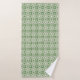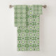 Two images show green and white towels. The top image features towels hung on a rod with a floral pattern. The bottom shows a single washcloth with a turned corner.