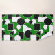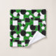 Este conjunto de toalhas tem um design de Bauhaus de triângulos, círculos, retângulos e pentágonos em preto e branco num campo de verde.