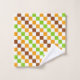 A vibrant checkered pattern of alternating green, orange, and brown squares on a white background. The design creates a lively, geometric feel.