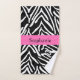 Conjunto personalizado de toalhas de impressão em zebra preto e branco. O design apresenta um padrão de zebra preto-e-branco e uma banda rosa-quente no meio com seu nome personalizado.