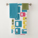 Este conjunto de toalhas tem um pano de lavagem verde, uma toalha de mão turquesa e uma toalha de banho com um design moderno do século médio de retângulos arredondados, alguns dos quais estão ligados e alguns com estrias, em retrógrados de vermelho, ouro, verde e turquesa. Se você gosta do design, mas prefere cores diferentes, me mande mensagem.