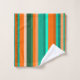 Este conjunto de toalhas tem um design de listras laranja e lacrimogêneas em vários tons rodando verticalmente nas toalhas.