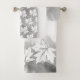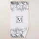 Cinza branca moderna, lavagem a cores e monograma do conjunto de toalhas de banho. A toalha de banho apresenta uma borda de folhas de maple branco na lavagem a cores da cinza e o seu monograma numa moldura com contorno colocado no centro. A toalha da mão mostra um padrão das folhas de maple e o pano de lavagem é coberto por uma camada de cor de água de cinza.