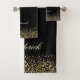 Um conjunto de toalhas de banho preto e de leopardo dourado. O conjunto inclui toalha de banho, toalha de mão e pano de lavagem. Podem ser comprados juntos ou separadamente. Personalize com seu nome ou Iniciais.