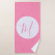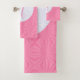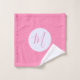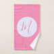 Bath, hand, and washcloth set with a personalized pink initial inside a white fractal circle of squiggly squares. Background is light pink squiggly squares. Special gift for mom om Mother's Day or birthday.