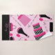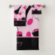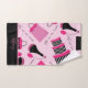 Este conjunto de toalhas de banho estilo Paris rosa e preto apresenta um pano de lavar, uma toalha de mão e uma toalha de banho. Usando um fundo rosa, há frascos de perfume, bolsas e caixas de chapéu. Você pode personalizar com texto na parte inferior. Faça seu pedido hoje!