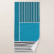 Este conjunto de toalhas tem um pano de lavagem de teal, uma toalha branca e uma toalha de banho com um design geométrico de um retângulo alto no canto superior esquerdo, listras de teal mais escuras no canto superior direito, um retângulo mais leve e menor sob as listras, e linhas pretas na parte inferior. Se você gosta do design, mas prefere cores diferentes, me mande mensagem.