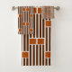 Este conjunto de toalhas tem um design geométrico de cinco linhas com duas caixas em cima repetidas sobre o design.