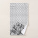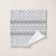 A característica de toalhas do banho e de mão pintou lírios nas máscaras das cinzas com tendrils e as folhas mergulhadas sobre um cinzento e um branco verificaram o fundo. Sua escolha de exposições do texto em um roteiro branco bonito sobre uma banda horizontal semi-transparente na toalha de banho. O pano da lavagem tem listras em máscaras de variação das cinzas sobre um fundo verificado. Trabalhos de arte e design por Karlajkitty
