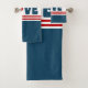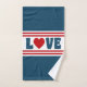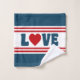 Design de amor com forma cardíaca em estilo náutico sobre fundo listrado a azul, vermelho e branco
