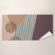 Este conjunto de toalhas tem um desenho abstrato moderno do século médio de uma linha azul, um triângulo bronzeado, e um círculo castanho feito de pontos em um campo de berinjela escura e creme. Se você quiser o mesmo design com cores diferentes, me mande uma mensagem.