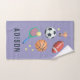 Este conjunto de toalhas roxas giro e giro para as crianças apresenta um padrão de desenho esportivo, com basquete, raquete e bola de tênis, futebol, futebol, troféu e estrelas. O conjunto de toalhas pode ser personalizado com o nome e o monograma de suas garotas. Perfeito para qualquer amante esportivo, excelente para crianças.