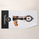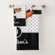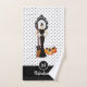 Projetada por Farida Greenfield. Uma ilustração de moda de uma senhora vestindo um lindo vestido preto elegante e elegante, segurando uma vassoura-bruxa decorada com fitas pretas com abóboras no primeiro plano e padrão de bolinhas preto e branco no fundo. Ele tem uma inicial de monograma personalizável e um nome no lado inferior. Design perfeito com tema do Dia das Bruxas.