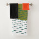 Este conjunto de toalhas tem um pano de lavagem laranja, uma toalha de mão preta, e uma toalha de banho com um design de curvas e linhas ziguezaguis modernas do século médio em preto, círculos em amarelo, laranja e verde, e um retângulo feito de linhas rasas. Se você quiser o mesmo design com cores diferentes, me mande uma mensagem.