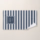 Conjunto de toalhas de banho monograma personalizado elegante, com marinho de padrão listrado azul e branco com suas iniciais e nome da família, com a data estabelecida em um quadrado marinho de borda azul com um texto branco clássico. Projetado por Thisnotme©