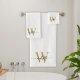 Conjunto de toalhas de banho personalizadas com monograma inicial em branco e dourado, estilo feminino moderno e sofisticado. Apresenta um primeiro nome (ou sobrenome) em uma linda tipografia de letra manuscrita com cauda swash (ou caligrafia) com monograma inicial em dourado e preto sobre fundo branco. Ótimo presente feminino e elegante para aquecimento de casa, também para aniversário, casamento, chá de noiva, despedida de solteira, dia das mães, festa de aniversário de 16 anos, presente de aniversário e para festa de formatura. É para a garota que gosta de coisas elegantes e sofisticadas.