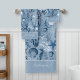 Este padrão submarino em tons clássicos de azul apresenta uma variedade de criaturas marinhas como cavalos-marinhos, águas-vivas, corais, estrelas-do-mar, algas marinhas e conchas. Os modelos de texto facilitam a personalização deste conjunto de toalhas de banho para uma decoração exclusiva do banheiro costeiro para sua própria casa ou para um presente.