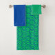 Este conjunto de toalhas tem um pano de lavagem verde, uma toalha de mão azul e uma toalha de banho com um design de arte de linhas curvas em forma de triângulo num campo de verde repetido através do design. Quer uma cor diferente? Me mande mensagem.