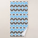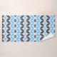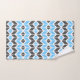 Estas toalhas de banho apresentam um padrão geométrico colorido de herringbone em azul, cinza escura e branco.
