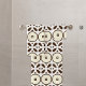 Design de toalha de banheira elegante com um padrão sem soldadura feito de formas geométricas marrons sobre um fundo branco cremoso.