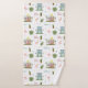 Padrão com ilustrações de casas modernas do século médio, flamingos, cactos, palmeiras e designs modernas do século médio. O pano de lavagem apresenta design cor-de-rosa e verde. A toalha de mão apresenta um padrão inspirado no século médio sobre fundo azul claro.