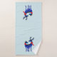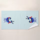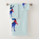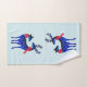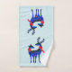 Toalhas de banho com um fundo azul esverdeado claro. Ilustrado com um par de cervos escandinavos azuis usando cachecóis vermelhos. Marcações decorativas em seus corpos.