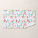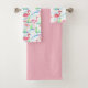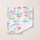 Um conjunto de toalhas com tema de lagoa apresentando um padrão de flamingos cor-de-rosa brilhantes caminhando numa lagoa ilustrada com destaque com uma toalha de banho rosa sólida e quente.