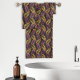 Este conjunto de toalhas do banheiro apresenta um padrão de frondes de folhas tropicais cor-de-rosa e douradas em um fundo preto.