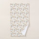 Toalha com padrão, com bombeiros brancos de cor d'água de rico com acentos de brilho dourado sujo. Cercados por folhas verdes e flores rosas selvagens.