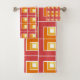 Este conjunto de toalhas tem um design geométrico de L's em vermelho, laranja e amarelo, colocado em diferentes direções num campo de branco.