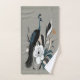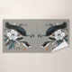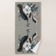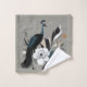 Um impressionante pavão preto rodeado por flores macias brancas e bege, acentuado com folhas pretas ousadas que ecoam sua presença dramática.